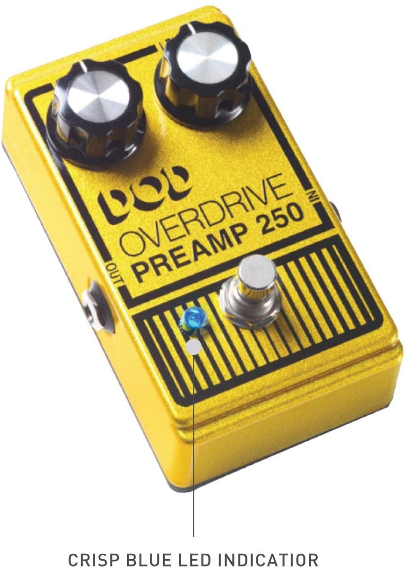 The legendary analog DOD Overdrive Preamp 250 is back, with over 40 years of history and experience behind it. The new 2013 version of the legendary DOD 250 captures all of the classic tone and wild heart of the original but in no way tames its performance. The 250 is better than ever before with true bypass, a crisp blue LED indicator, gobs of output, and modern 9V DC power supply input. Redesigned with a lighter aluminum chassis, sleek yellow metallic flake and flat black matte bottom paint job, the 2013 DOD Overdrive Preamp 250 pedal is the perfect sonic foundation to carry on the legacy of DOD. The DOD Overdrive Preamp 250 (2013) has Gain and Level controls, like its predecessors. Gain controls the amount of distortion, from just a touch of grit to all-out grind. Level dials in some subtle body for “always on” performance or huge amounts of boost for boosting solos above a dense stage mix. With the Gain all the way down, crank up the Level to boost your sound and cut through during your solos. True bypass allows your guitar tone to remain pristine even when the new DOD 250 (2013) is off. This is a big difference from the original which would color your bypassed tone. The modern 9V DC power supply input make the pedal more pedal board friendly.