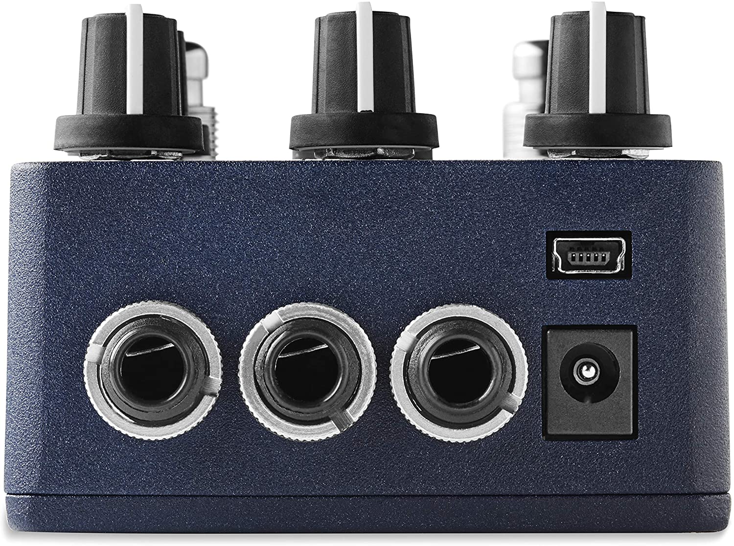 When the shift button is held down, the top row of knobs adjust delay parameters. The low and high damping knobs adjust dynamics for ducking reverb or an expander for more reverb on louder notes, with adjustable threshold and recovery time. Holding down the foot switches gives you two different types of infinite sustain.