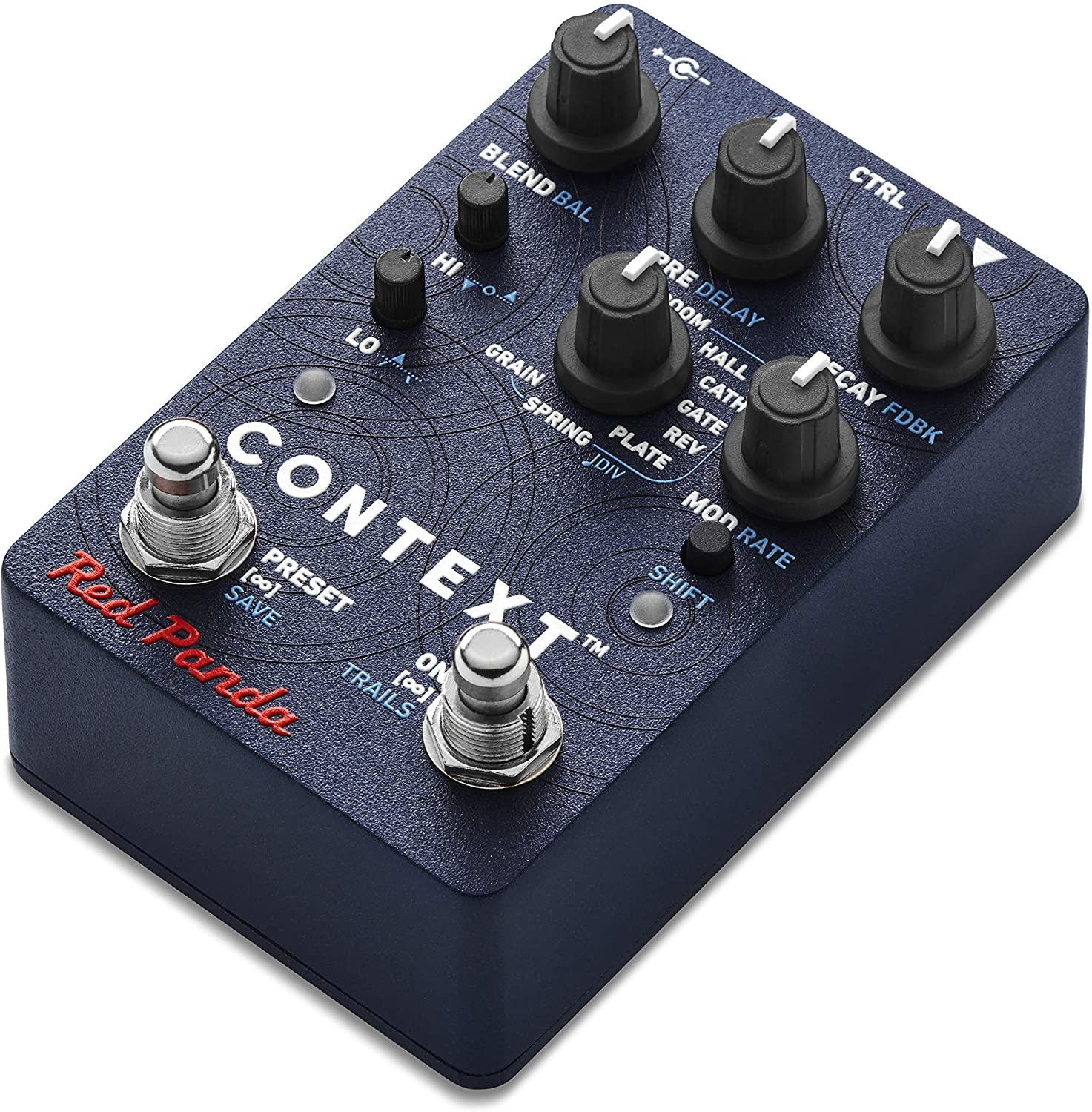 The Context is a reverb pedal inspired by 1980’s rack mount reverbs. It has 8 algorithms, including room, hall, cathedral, gated reverb, reverse reverb, plate, spring, and a granular reverb. Each algorithm features separate high and low frequency damping controls, pre-delay, modulation, dynamics (duck/expand), and infinite hold. In addition, delay is always available, along with tremolo in spring mode.
